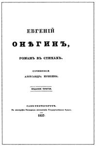 Это «третье» (последнее прижизненное издание) издание, ныне представляющее исключительную редкость, было осуществлено под руководством книгопродавца Ильи Глазунова и вышло в свет в январе 1837 г., наверняка до 19 января — в этот день его рекламировали «Санкт-Петербургские ведомости» (приложение 14, с. 114). Небольшой томик (32°) хвалили и в разделе «Новые книги» литературного обозрения «Северная пчела» (№ 16, с. 61–63) от 21 января за его удобный карманный формат. В. Набоков. Комментарий к роману А. С. Пушкина «Евгений Онегин» Текст в взят с сайта http://imwerden.de сверен с репринтом, приведеным в «Комментарии» |