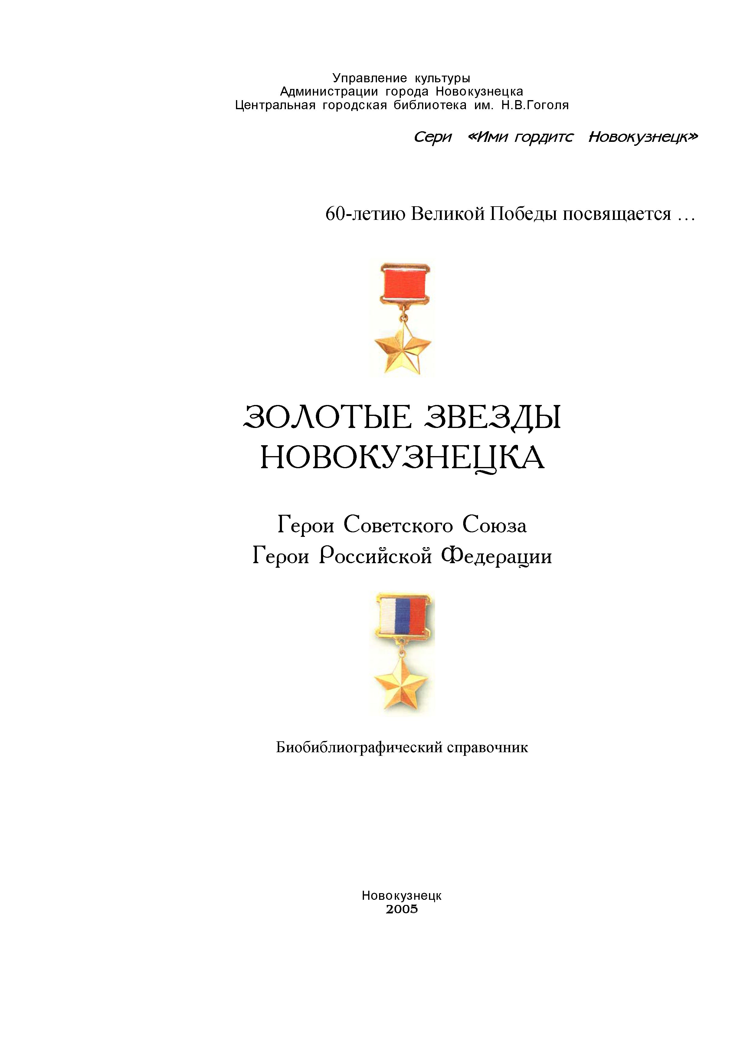 Издание продолжает серию справочников «Ими гордится Новокузнецк» и создано на основе печатных источников из фондов Центральной городской библиотеки им. Н. В. Гоголя (г.Новокузнецк), документов из архивных фондов. Многие имена установлены только по публикациям в периодических изданиях, в справочные издания сведения о них не вошли. Книга включает материалы о 52 новокузнечанах, удостоенных высокого звания «Герой Советского Союза» и «Герой Российской Федерации» за боевые подвиги. Отбор материала закончен в марте 2005 года. Материал сгруппирован в алфавите персоналий и включает сведения о Героях, которые • родились в Новокузнецке или Новокузнецком районе, • призывались Новокузнецким военкоматом, • жили и работали в Новокузнецке или Новокузнецком районе в разное время. Персональные блоки включают: биографический очерк и список литературы о персоне |