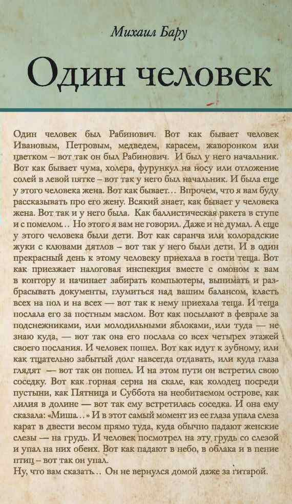 Название книги: Один человек Авторы: Бару Михаил Борисович Жанры: prose_contemporary, humor_prose Файл: fb2-495000-500999.zip/500467.fb2 Размер файла: 1,2 МБ Язык: Русский |