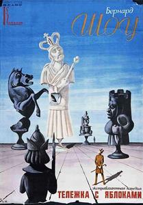 «Тележка с яблоками» - сатирическая комедия подчеркнуто политического направления. Она была первой из тех пьес Шоу, которые он сам назвал «политическими экстраваганцами». Объективно новая форма была обусловлена двумя обстоятельствами: сатира Шоу обращалась отныне против политической системы и государственного строя капиталистической Англии. Таким образом, «Тележка с яблоками» - острый политический памфлет, пьеса-гротеск, обличающая буржуазную демократию и изображающая будущее Англии. В оформлении обложки использован плакат Н. П. Акимова к одноименному спектаклю Ленинградского государственного театра комедии |