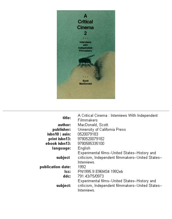 Название книги: A Critical Cinema 2: Interviews with Independent Filmmakers Авторы: MacDonald Scott Жанры: nonfiction, cine Серии: A Critical Cinema No в серии:2 Файл: fb2-400000-405999.zip/400238.fb2 Размер файла: 3,4 МБ Язык: Английский |