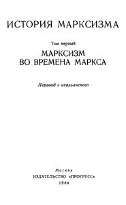 Итальянское леволиберальное издательство «Эйнауди» выпустило в свет коллективный труд «История марксизма», охватывающий исторический период от начала деятельности К. Маркса и Ф. Энгельса до наших дней. Этот труд вышел в четырех томах: «Марксизм во времена Маркса», «Марксизм в эпоху II Интернационала», «Марксизм в эпоху III Интернационала», «Марксизм сегодня». При всех имеющихся недостатках и пробелах первый том «Истории марксизма», как и все это фундаментальное издание, содержит немалый познавательный материал как фактологического, так и аналитического свойства и в этом плане может заинтересовать советских специалистов. В целях информации издательство «Прогресс» направляет читателям перевод первого тома итальянского четырехтомника «История марксизма»