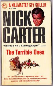 How did beautiful women come to be known as ‘The Terrible Ones’? Nick Carter, top agent of AXE, sometimes known as Killmaster, had his hands full finding out. Not that he didn’t have other things on his mind. The Chinese Communists weren’t in beautiful Dominica to sun themselves — and ‘Operation Blast’ wasn’t the nickname of a drinking-contest. Tnujillo’s last diabolical joke had been to leave a hundred million dollars in potential munitions money — a fortune in gold and jewels buried somewhere on the island, tantalisingly hidden right under everybody’s nose! And as if Nick Carter didn’t have enough trouble on his hands, there was always the danger of an ecstatic death from THE TERRIBLE ONES |
