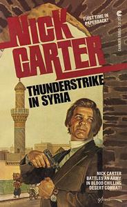 DEATH IN THE DESERT! The Syrian Liberation Army, a fanatical group driven by “The Hawk,” are expanding their activities — if they succeed a tanker will explode in New York Harbor wasting a million lives! And that’ll be just the beginning! Nick Carter enlists double agent Miriam Kamel to lead him to the terrorists’ desert camp under the spectacular ruins of The Tower of Lions. Miriam’s an expert in the arts of love and war — but Nick wonders if she’s as clever at deceit... Under the chilling desert moon, amid the dying cries of “The Hawk’s” torture victims, Nick is trapped in a nerve shattering battle. His Israeli friends call him Lamedvovnik — the secret saint. But as time runs short N-3 could quickly become another kind of “saint” — a very dead martyr! |