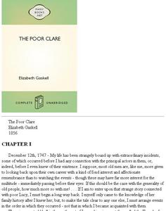 Elizabeth Gaskell was a Victorian short storywriter and novelist. Her biography of Charlotte Bronte is her most famous work. Gaskell's novels portray varied social classes. Gaskell saw and wrote about the problems caused by the gulf between the social classes. She fought for tolerance and better labor conditions. The Poor Clare is an 1856 gothic ghost story told in a series of narratives. Bridget, the grandmother, invoked a phantom who is now haunting the pure and innocent Lucy. The story is full of intergenerational secrets |