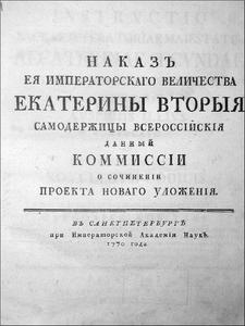 «Наказ» — концепция просвещённого абсолютизма, изложенная Екатериной II в качестве наставления для кодификационной (Уложенной) комиссии. В соответствии с Википедией значительная часть текста (ок. 350 статей) заимствована из трактатов Шарля Монтескьё «О духе законов» и Чезаре Беккариа «О преступлениях и наказаниях». Остальные статьи являются компиляцией публикаций Дени Дидро и Жана Д'Аламбера из знаменитой «Энциклопедии» |