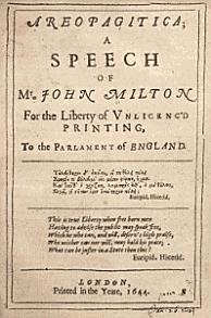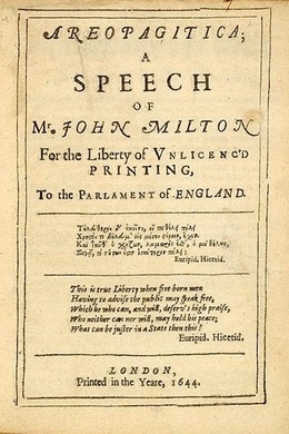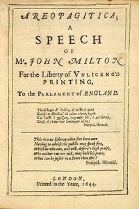 Areopagitica: A speech for the Liberty of Unlicensed Printing to the Parliament of England is John Milton’s famous tract against censorship. Named after a speech by Isocrates, a fifth century BC Athenian orator, the work is counted as one of the most influential and inspired defenses of the right to freedom of expression in history. It is also a personal issue for Milton who was submitted to censorship himself when he tried to publish his defenses of divorce, radical works for the time that gained no quarter with censors. Distributed as a pamphlet, Milton’s powerful arguments against 1643’s Licensing Order note that classical Greek and Roman society was never subjected to such censorship, and he uses many classical and biblical references to reinforce his argument |