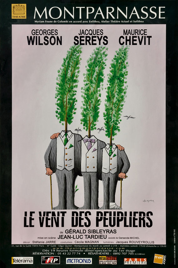 Речь идет о трех стариках, живущих в Доме для военных ветеранов. Они — ветераны еще Первой мировой. Рене живет здесь уже 25 лет, Фернан — 10 лет, Густав — шесть месяцев. У Фернана осколок в голове, и он постоянно падает в обморок, у Рене — больная нога, Густав почти недвижен и никуда не выходит. И в жизни они мало что видели, как будто и не были никогда молодыми. Но ни они над собой, ни автор над ними не плачут. Напротив, смех — стихия пьесы, и нежность, и любовь к человеку. Впервые за много лет появилась комедия без черноты, без жестокости, без цинизма, где старики вечно остаются молодыми не после смерти, а при жизни, где безрассудный их побег из действительности воспринимается как единственно правильное решение и подтверждается чудом ожившей статуи. Пьеса была номинирована на премию Мольера в пяти номинациях (2003), а английский перевод, сделанный Томом Стоппардом, получил премию Лоренса Оливье в номинации «Лучшая комедия» (2006). Спектакли по пьесе были поставлены во многих российских театрах, в том числе в театре им. Е. Вахтангова и «Сатириконе». Существует также русский перевод Гаянэ Исаакян-Арну под названием «Тополя и ветер» |