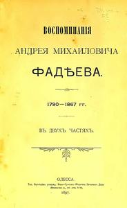 Андрей Михайлович Фадеев — российский государственный деятель, Саратовский губернатор, позднее — высокопоставленный чиновник в Закавказском крае, тайный советник. С 1817 по 1834 год он служил управляющим конторой иностранных поселенцев в Екатеринославле. Затем был переведён в Одессу — членом комитета иностранных поселенцев южного края России. В 1837 году, после Одессы, А. М. Фадеев был назначен на службу в Астрахань, где два года занимал пост главного попечителя кочующих народов. В 1839 году Андрей Михайлович переводится в Саратов на должность управляющего палатой государственных имуществ. 1846 года Фадеев получил приглашение князя М. С. Воронцова занять должность члена совета главного управления Закавказского края и, вместе с тем, управляющего местными государственными имуществами. Оставаясь на службе в Закавказском крае до конца своих дней, в 1858 году был произведен в тайные советники, а за особые заслуги при проведении в Тифлисской губернии крестьянской реформы — награжден орденом Белого Орла (1864) и золотой, бриллиантами украшенной, табакеркой (1866). «Воспоминания» А. М. Фадеева содержат подробную автобиографию, в которой также заключается много метких характеристик государственных деятелей прошлого, с которыми Фадееву приходилось служить и сталкиваться. Не менее интересны воспоминания автора и об Одессе начала XIX века. Приведено к современной орфографии |