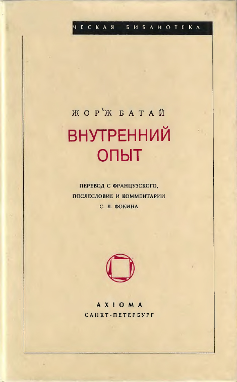 Внутренний опыт / Пер. с франц., послесловие и комментарии С. Л. Фокина. — СПб.: Аксиома, Мифрил, 1997. — 336 с. (Критическая библиотека) Главный философский труд Жоржа Батая (1897—1962), впервые издаваемый на русском языке. Для философов и литературоведов, для широкого круга читателей, интересующихся историей западноевропейской мысли XX века. ISBN 5-86457-096-7 © Editions Gallimard, 1954 © С. Л. Фокин, перевод, послесл., коммент., 1997 © А. Г. Наследников, дизайн серии, макет, 1997 |