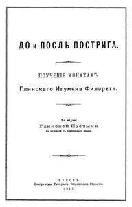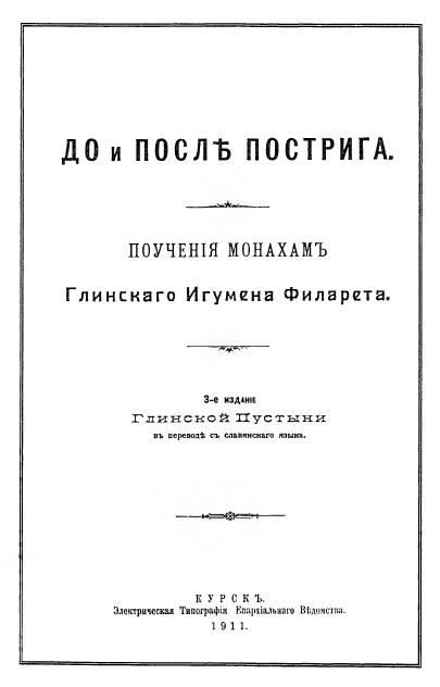 ПОУЧЕНИЯ МОНАХАМ ГЛИНСКОГО ИГУМЕНА ФИЛАРЕТА (Данилевского) (1777–1841). Цит. по изданию «Схиархимандрит Иоанн (Маслов). Глинский патерик». — Москва, "Самшит", 1997, стр. 83-105 |