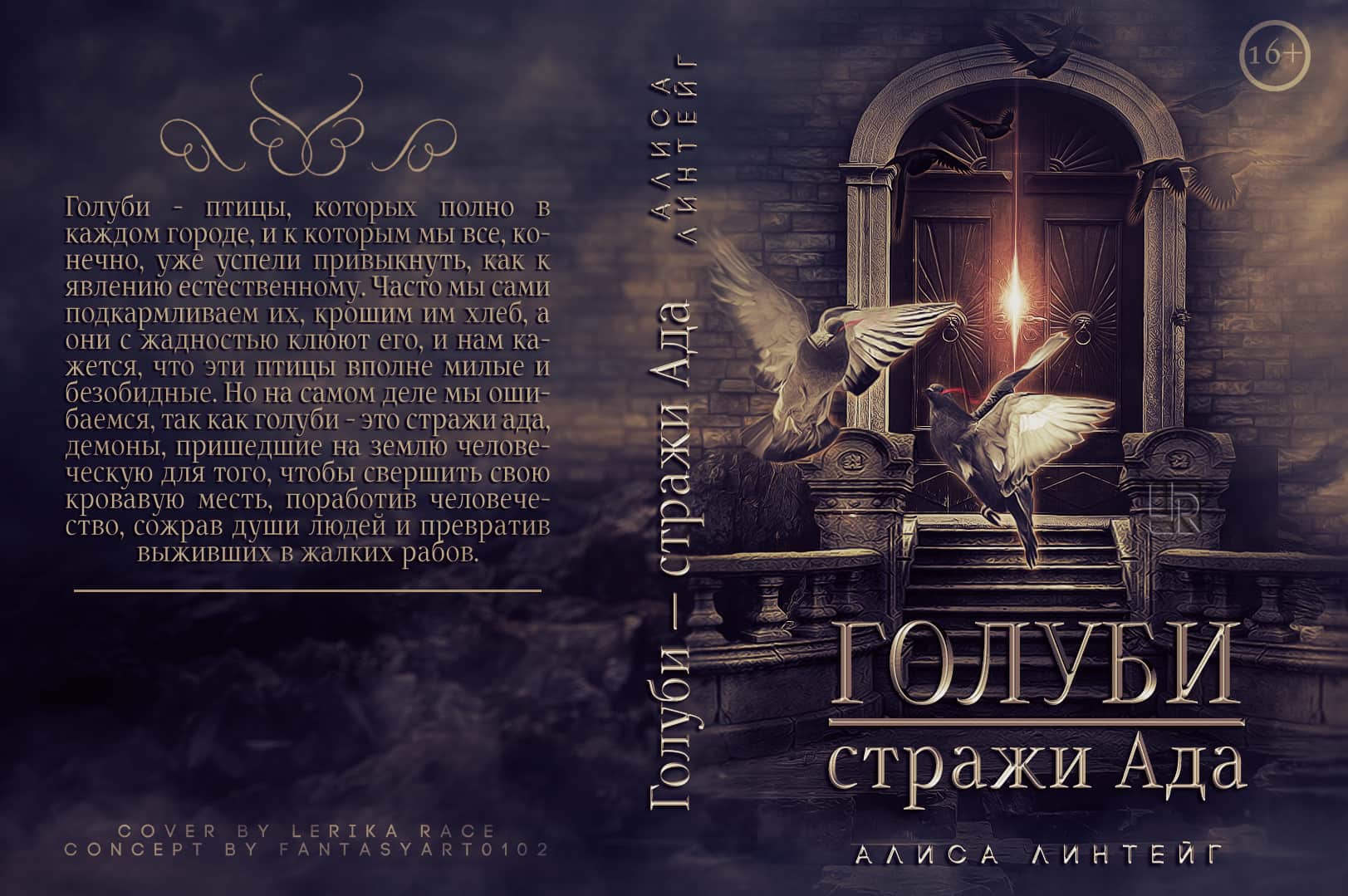 Голуби — птицы, которых полно в каждом городе, и к которым мы все, конечно, уже успели привыкнуть, как к явлению естественному. Часто мы сами подкармливаем их, крошим им хлеб, а они с жадностью клюют его, и нам кажется, что эти птицы вполне милые и безобидные. Но на самом деле мы ошибаемся, так как голуби — это стражи ада, демоны, пришедшие на землю человеческую для того, чтобы свершить свою кровавую месть, поработив человечество, сожрав души людей и превратив выживших в жалких рабов. Метки: смерть основных персонажей, фэнтези, мистика, экшн, повествование от первого лица, смерть второстепенных персонажей. Примечания: Я просто общалась со своим другом на тему о голубях и внезапно вдохновилась. Конечно, этот ориджинал получится немного (совсем немного) упоротым, и я думаю, по названию и описанию это понятно… За обложку спасибо мастеру Lerika Race, авторская группа https://vk.com/lerika_studio. Группа с моим творчеством: http://vk.com/club78557547 |